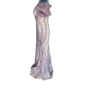 Off-Shoulder Lavender Sheer Evening Gown With Beaded Embroidery & Leaf Motif Pat
