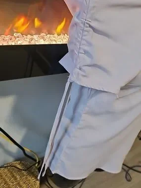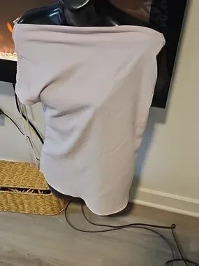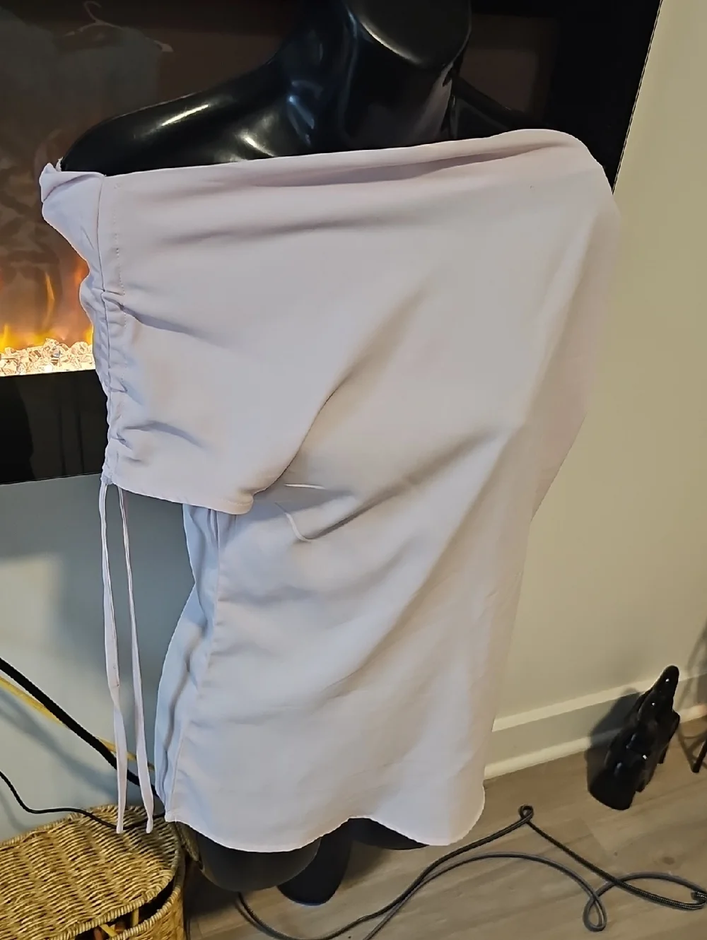 Soft off-shoulder blouse. Light lavender color with adjustable side drawstrings. Smooth, flowy fabric. Feminine and versatile.