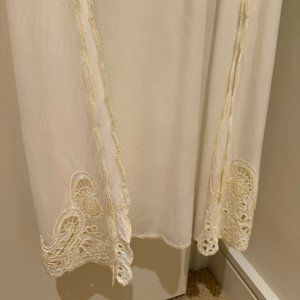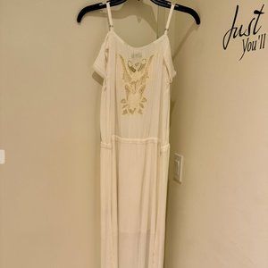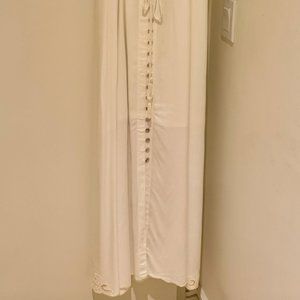 Off-shoulder maxi dress. Buttons are made from natural shells—embroidery on the back and bottom around the slit.