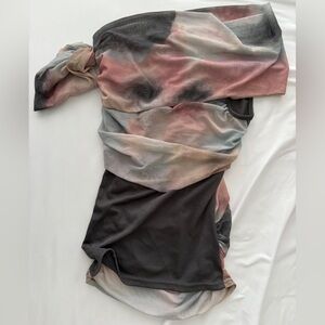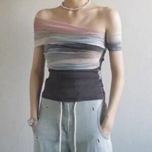 Stylish off-shoulder top featuring a blend of pastel hues. Perfect for a chic and casual look. Worn only once. In perfect condition.
