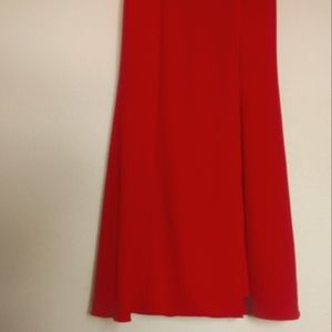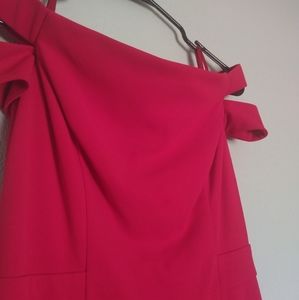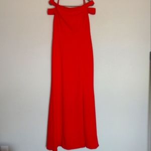 Elegant off-shoulder red dress with a sleek silhouette and thigh slit. Designed for formal events and evening wear. Comfortable fit that flatters the figure and highlights the shoulders.