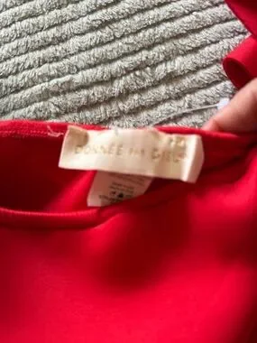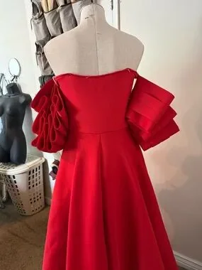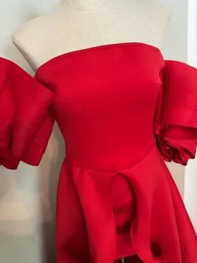 Stunning off-shoulder red high-low dress with cascading ruffle skirt. Structured bodice and dramatic sleeve bows create a modern, flattering silhouette. Ideal for formal events and special occasions in bold red.