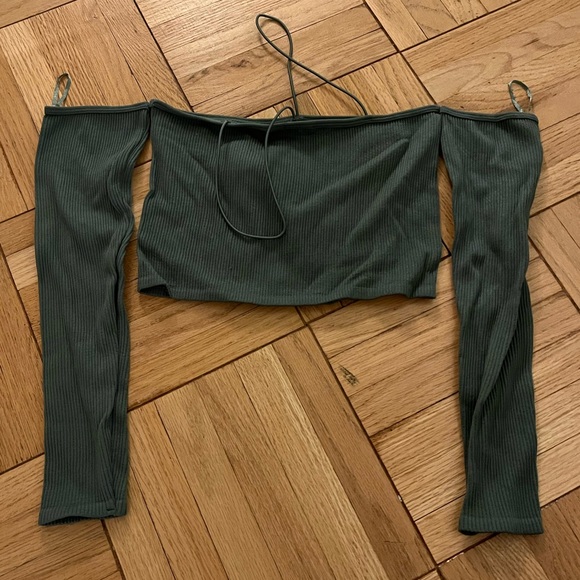 Stylish off-shoulder ribbed top in a chic green color. Perfect for casual outings or a night out. Comfortable and trendy design.