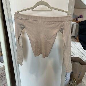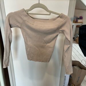 Stylish off-shoulder ribbed sweater in a neutral tan color. Perfect for casual outings.