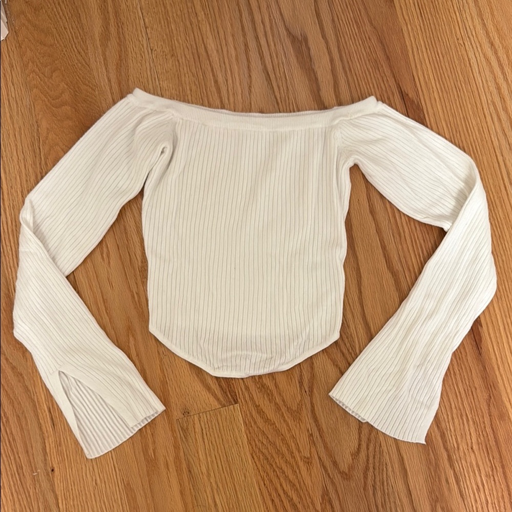 Elevate your style with this chic off-shoulder ribbed sweater. Perfect for any occasion, this cream sweater offers both comfort and elegance.