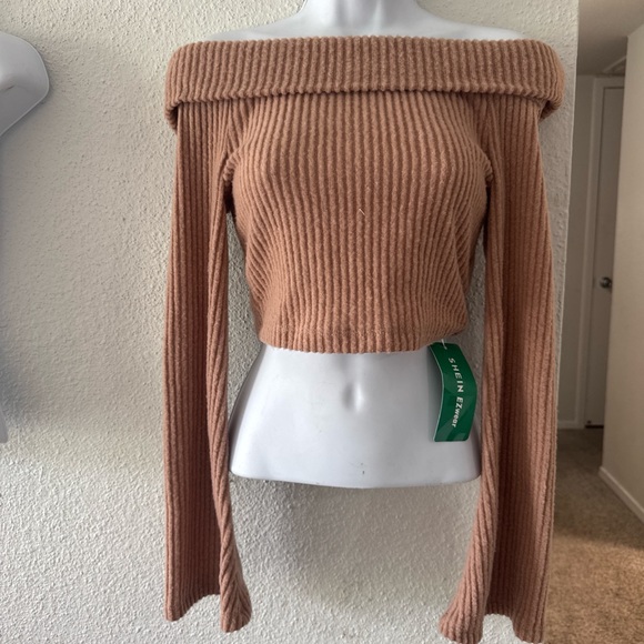 Stay stylish and cozy with this off-shoulder ribbed sweater. Perfect for any occasion, this tan sweater adds a touch of elegance to your wardrobe.