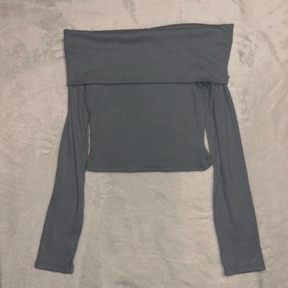 It’s like a mix of gray and light blue. Trendy off shoulder top