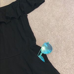 Black off shoulder romper made of lightweight breathable fabric. Elastic waist, has pockets! Worn twice, no defects! It is a size medium, but fits like a small.
