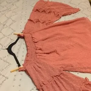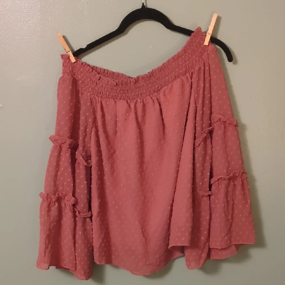 Chic off-shoulder blouse with large ruffle sleeves. Perfect for casual outings. no size tag. Approximate size medium. this blouse is shear/see through material. the front side is double lined. The back is not.