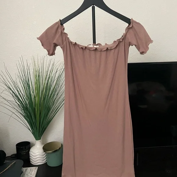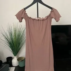 Chic off-shoulder ruffle dress in a stylish mauve color. Perfect for casual outings.