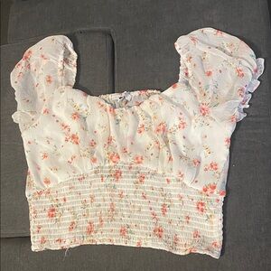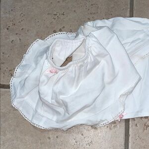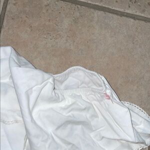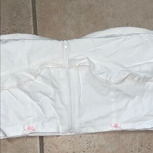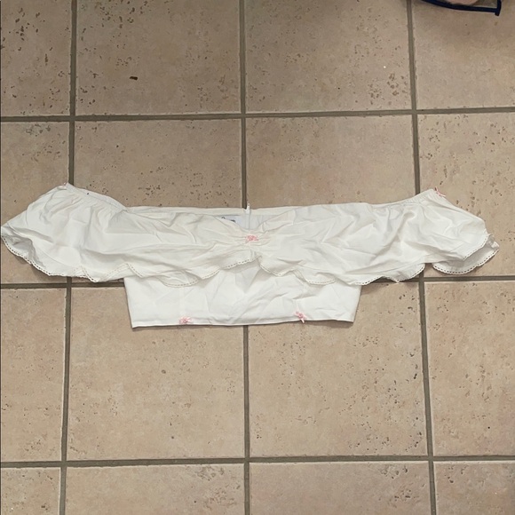 Chic white off-shoulder top with ruffle and pink bow details. Perfect for a stylish look.