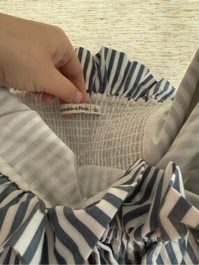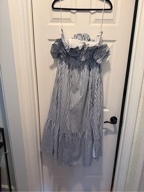 off the shoulder silhouette with a ruffled neckline. Fitted bodice flows into a skirt. side slit adds movement. Side pockets for discreet storage.