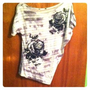 WORN ONCE. Goes off the right shoulder. Grey with grey stripes. Two black roses that have silver glitter on them.