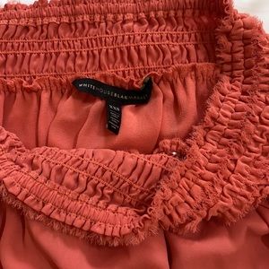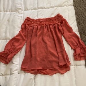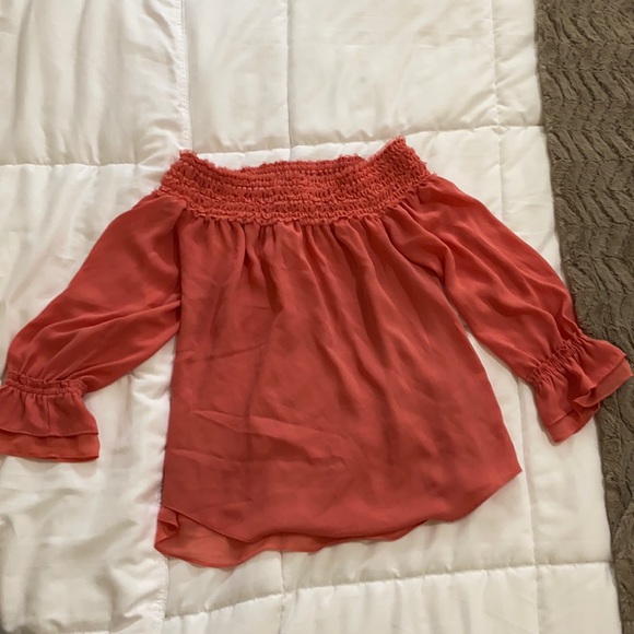 Pretty coral colored off shoulder top. 3/4 bell sleeves, approx 16.5” in length. Measures 16” across the shoulder area (un stretched). Great condition, only worn a couple of times. Sized XXS, but fits like an XS. Would fit up to size 4 depending on how fitted you like it.