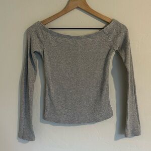 Grey off-the shoulder neckline, long sleeves, bare midriff crop top. Slim fit, tight-fitting, ribbed knit, stretchable fabric. Approximately 16” long and 14” across the bust. Pre-owned in good condition.