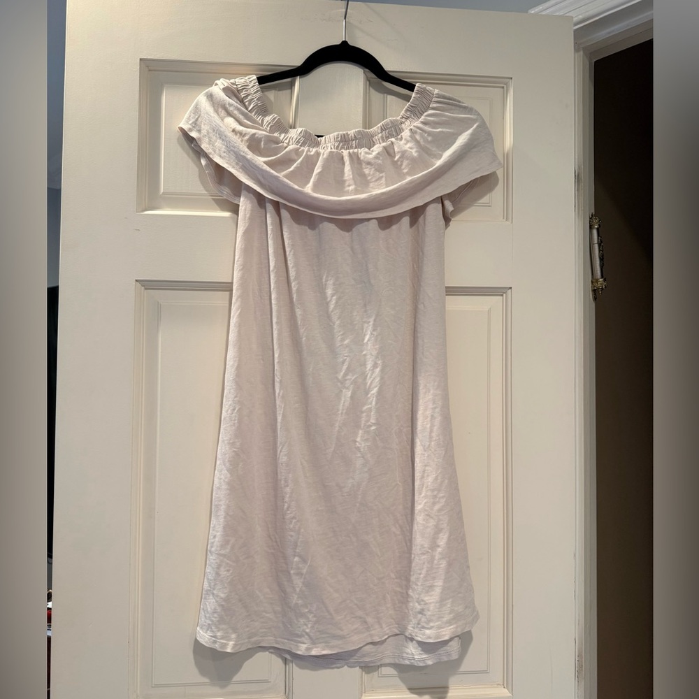 Lightweight off-shoulder dress with a ruffled neckline. Simple and breezy silhouette. Soft white color for versatile styling. Go from beach to town to dinner in this fun dress.