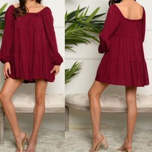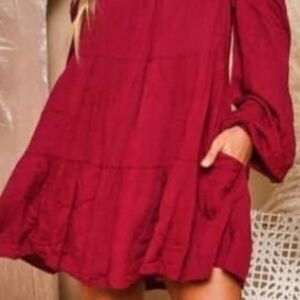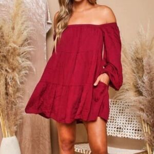 Off Shoulder Mini Dress. Beautiful red bergundy tiered mini dress that can be worn on or off shoulder. Also features pockets.