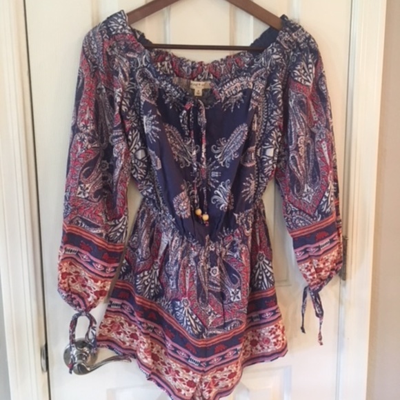 Off-The-Shoulder Romper is Long Sleeve with Tie Cuffs; Front keyhole with tie closure; Elasticized waistband.