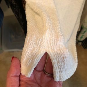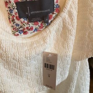 Crisp white and textured. Can be worn on or off the shoulder. Gorgeous ruffle on front and back. Side cuts at the bottom for a flattering fit. Will fit med/lg body types and has nice stretch.