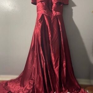 Prom Dress off-the-shoulder. Vnaix Brand Wedding Dress. Burgundy off-the-shoulder prom dress. High/Low Style. Satin. Strap Closing on back of dress. Waist 32inches. Bust 33/34inches. Prom or Wedding Dress. New without tag