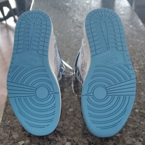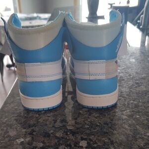 Stylish and iconic, the Off-White Air Jordan 1 kids shoes feature a striking blue and white design. Perfect for young sneaker enthusiasts, these shoes offer both comfort and a bold look.