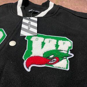 The front is black with white leather sleeves and is richly embroidered with appliqués, including green lettering, the numbers ""22-23,"" and graphic patches.
