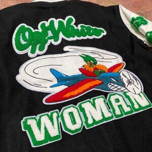 The back, set against a black background, features the prominent ""Off-White"" embroidery and an embroidered image of a cartoon character flying an airplane, with the word ""WOMAN"" underneath.