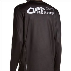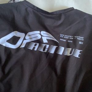 Stylish Off-White long sleeve tee. Black with orange graphic details. Comfortable and trendy.