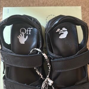 Stylish Off-White sandals. Features black straps. Comfortable design. See pictures for details