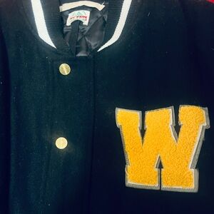 Off-White Black Varsity Jacket with White Stripes and Multicolor Patches