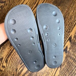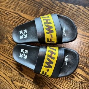 Stylish Off-White sandals. Black base with yellow branding. Comfortable and trendy.