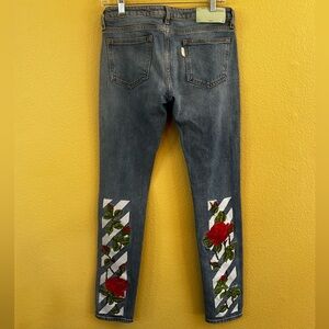 Stylish skinny jeans by Off-White. Features blue denim with red floral accents. Perfect for a chic look.
