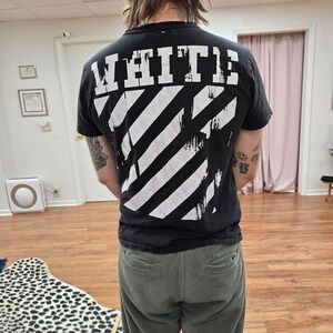 Off-White, graphic tee, black t-shirt, distressed design, size S, streetwear, fashion tee, casual wear, designer shirt, urban style