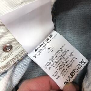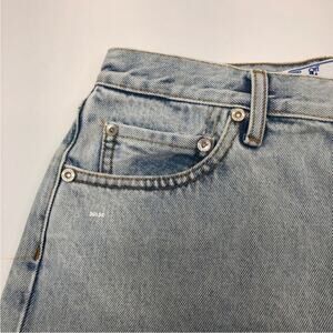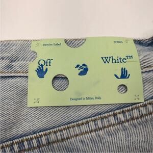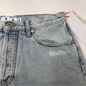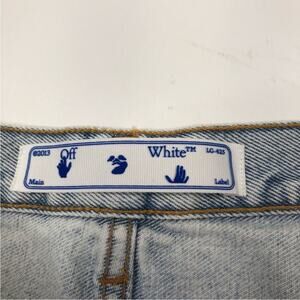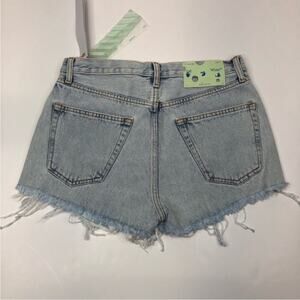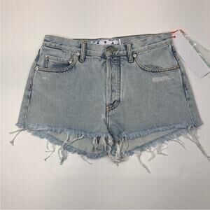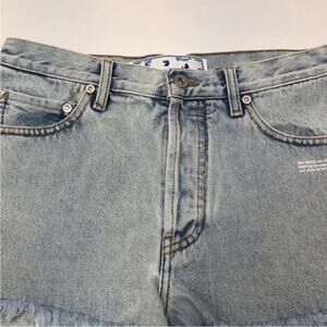 Off-White Frayed Hem Bleach Shorts in Blue Light Wash. Crafted from 100% cotton, these shorts offer a comfortable, breathable fit with a vintage-inspired light wash and unique bleached effect. The high-rise waist provides a flattering silhouette, while the raw, frayed hem adds an edgy, lived-in feel. Featuring a classic 5-pocket design and a button and zipper waist closure, these shorts combine functionality. Making these shorts the perfect statement piece for any laid-back, cool-weather outfit.