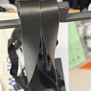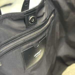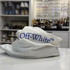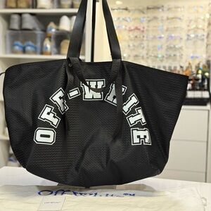 Sleek black tote bag. Features secure zipper pocket. Stylish Off-White branding.