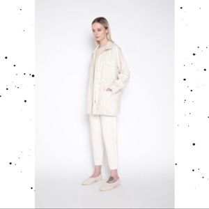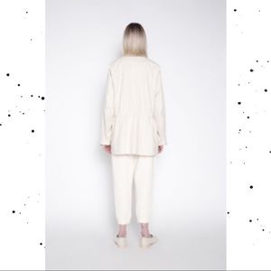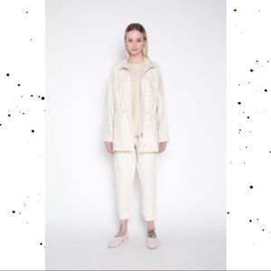 The perfect jacket for this season is made of a lightweight linen blend material. It features front pockets, snap closures, sleeve pleats for detail, clean vertical lines of extended fabric at the back, and a cinched waist for a silhouette with shape. Try pairing this piece with a cropped trouser and flats for an easy casual look.