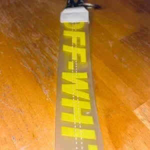 Bold Off-White keychain featuring vibrant yellow text. Ideal for adding a pop of color.