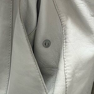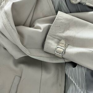 Classic racer jacket in off-white (almost light gray) sheepskin. Lots of life left, but does show some signs of wear.