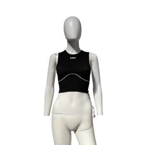 Off-White Logo-Print Black Polyamide Crop Top Size S/M: seamless construction, curved hem, white logo, sleeveless, round neck.