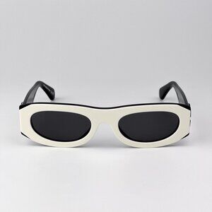 The Off-White ORLANDO sunglasses (model OERI13O, color code 0107) feature a bold white and black oval frame paired with dark grey lenses. Designed for a unisex fit, this standout piece blends retro shape with modern edge. Crafted from premium acetate and made in Italy, it's a striking addition to any designer eyewear collection.