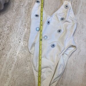 Off-White One Piece Bathing Suit With Several Round Silver Embroidery surrounded by Reflective Embellishments on Front, resembling mirrors, High-cut leg. Appropriate Measurements: Taken when laying flat 23”L x 10” W Preowned. Shows some signs of wear marks, snag, etc. See pictures back strap marks.