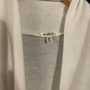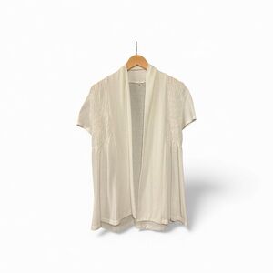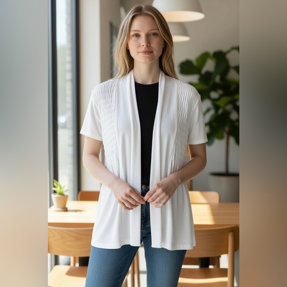 Chic short sleeved cardigan with open front. Ideal for layering.