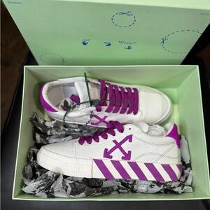 Brand New OG all. Classic Pair. Stylish Off-White sneakers. Features purple accents. Iconic arrow design. Comfortable fit.
