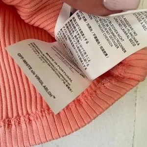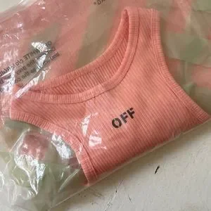 Off-White ribbed crop top with racerback silhouette. Soft stretch fabric. Small black Off logo at center back. Casual staple for layering or warm days.