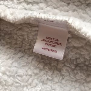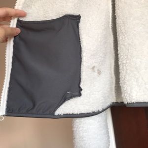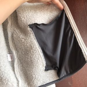 Snuggly teddy fluff inside and out! Perfect for spring and fall transitional weather. 2 front pockets, front zip, grey trim at hem and cuffs. 100% polyester.