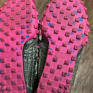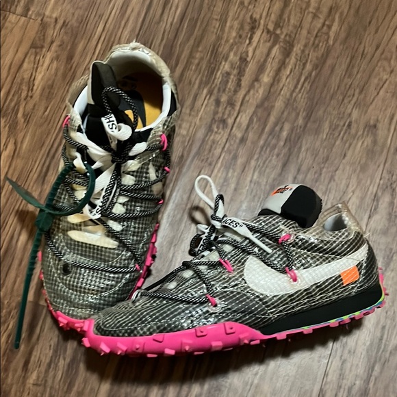 worn Off-White Waffle Racer sneakers. Pink, Black & White. Please review all pictures. priced to sell quickly. These are very comfy. Feels like walking on soft cleats.