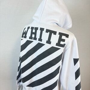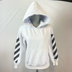 Stylish Off-White hoodie with bold black stripes. Features a comfortable hood and striking design. Minor stains, pls see attached photo.
