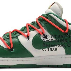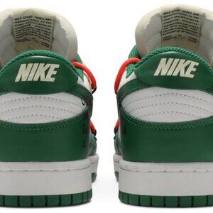 Virgil Abloh explores the art of deconstruction and recreation with an OFF-WHITE x Nike Dunk Low three-piece capsule collection. Released in December 2019, this version sports a Pine Green and White leather upper, bold branding across the medial, and an Orange Flag Swoosh to the lateral. Shimmering Flywire secondary lacing and a raw edge tab with Abloh's signature aesthetic. Its classic rubber sole echoes the scheme.