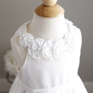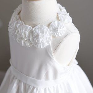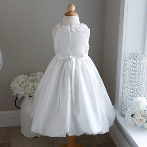 This Girl's size 5 Formal Dress is Stunning!! The Taffeta dress in done in a beautiful Soft/Off White/Ivory Hue. A Halter style neckline is flattering and adds sophistication. The halter neckline is trimmed in stunning matching fabric flowers that have pearl, clear sequin and seed bead accents. The waist gathers and has a 1" matching sash that ties in the back (sew in place so no riding-up). The back has a zipper closure. The skirt is the icing-on-the-cake! Side seam hidden pockets are a bonus for little treasures or tissues. The bubble hem adds not only sophistication, but Sass! A beautiful tiara is included. It is done in a silver colored base with pearl and rhinestone accents. Ivory satin ribbons tie together into a bow for a perfect fit and stream down the back. This is one of the prettiest and most classy little sets I have seen for little girls!! Brand New With Tags!!