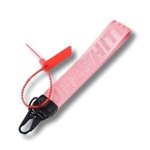 Chic Off-White keychain in pink with black accents. Features a bold red tag. Ideal for a stylish touch.